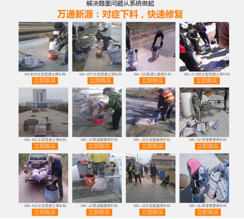 大慶萬通新源科技有限公司獨有的混凝土路面高強(qiáng)速補(bǔ)料,是水泥混凝土路面病害修復(fù)的好材料。疲勞、凍融循環(huán)、彎曲壓力、滲水和基層破壞等原因都會引起水泥路面的破損,從而帶來高昂的維護(hù)費(fèi)用。與以往的剛性修補(bǔ)方法不同,混凝土水泥路面維修速補(bǔ)膠提供了一種獨特的柔性修補(bǔ)產(chǎn)品和技術(shù),高柔性、高抗拉性,可跨伸縮縫施工和高抗壓性使得混凝土快補(bǔ)產(chǎn)品為水泥混凝土路面提供了******性的修補(bǔ)。傳統(tǒng)的剛性修補(bǔ)方案,如環(huán)氧砂漿和快干水泥產(chǎn)品,由于其自身的粘結(jié)失效,抗疲勞性低以及與原路面不同的伸縮系數(shù),修補(bǔ)面會在短時間內(nèi)失效或產(chǎn)生新的裂縫,需要反復(fù)修補(bǔ),有效期短且費(fèi)用高昂。大慶萬通新源科技有限公司的混凝土水泥路面維修速補(bǔ)膠可以隨原路面一起伸縮,移動,從而避免了粘結(jié)失效和產(chǎn)生新裂縫。萬通快補(bǔ)產(chǎn)品優(yōu)異的粘結(jié)性、柔韌性和高防滑性,特別適用于水泥路面的淺層粘合修補(bǔ),多邊角混凝土板層修補(bǔ),跨伸縮縫修補(bǔ)以及路面沉陷修補(bǔ)。萬通混凝土病害修補(bǔ)料針對混凝土起皮起沙、斷板裂縫、蜂窩麻面、坑槽露石子、漏筋掉皮、橋梁的掉皮漏筋快速通車使用時間長。應(yīng)用萬通快補(bǔ)產(chǎn)品,施工后一天就可以恢復(fù)交通。大慶萬通新源科技有限公司的萬通水泥路面維修速補(bǔ)膠適用于高速公路、機(jī)場路面、農(nóng)村村村通路面、廠坪、學(xué)校操場、市區(qū)公路、小區(qū)路面、橋梁、水泥路面的修補(bǔ)。使用萬通特快補(bǔ)材料修補(bǔ)路面可以一勞永逸! 水泥地面起砂怎么辦,混凝土修補(bǔ)劑混凝土地面起砂,混凝土地面修補(bǔ),地面起砂怎么辦,